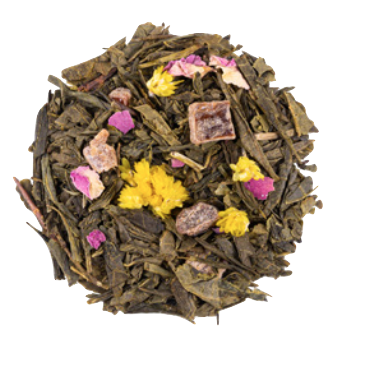 Ce thé a une saveur de rose fruitée. Ingrédients: Thé vert China Sencha* (77%), datte (datte, farine de riz)* (22%), fleurs d’immortelle*, pétales de rose*, arômes naturels de framboise, de cassis, de frais, de rose.